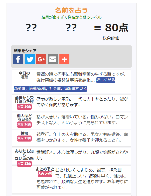 もう名字の時点で最高点が決まっているという感じである。(体感)どんだけ下の名前を変えてもまぁー90点は乗らない。